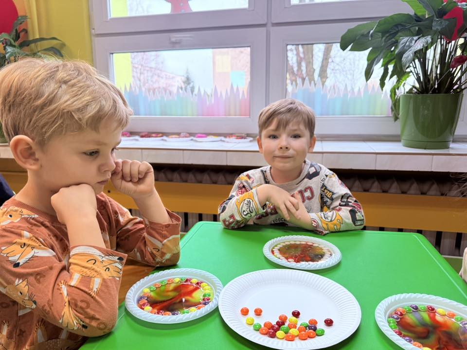 Drugim doświadczeniem była „tęcza z cukierków” . Po ułożeniu kolorowych cukierków na talerzu i dolaniu odrobiny wody mogliśmy podziwiać, jak barwy powoli się rozpuszczają i tworzą piękną, kolorową tęczę.