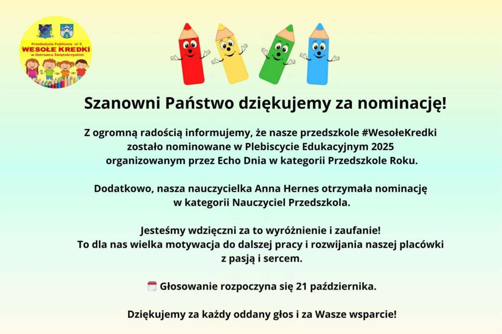 21 październik Nominacja naszego przedszkola w Plebiscycie Edukacyjnym 2025 na Przedszkole Roku Z życia przedszkola, Nasze przedszkole Leave a comment Zachęcamy do głosowania https://echodnia.eu/przedszkole-publiczne-nr-5-wesole-kredki/pk/8131691?fbclid=IwY2xjawNkysVleHRuA2FlbQIxMABicmlkETA2c08zOURhRGRrZldSZXR2AR5W-5fElw0hnXkPJ5DnyfCgOWEG2MMGxcOznAtHOUcyygB1QeAnKQPOBRvZeA_aem_jarWkiIiJX_8-GN8lxdh-g https://echodnia.eu/anna-hernes/pk/8106369?fbclid=IwY2xjawNkzRdleHRuA2FlbQIxMABicmlkETA2c08zOURhRGRrZldSZXR2AR5OuINjAR772rvmrmW064aAuSw6Qei8qwO1814MaW1NzIC5TlReAaDzZANl2g_aem_nDz1pVIW88X_TQH0A0rqxg Odsłon: 3,691