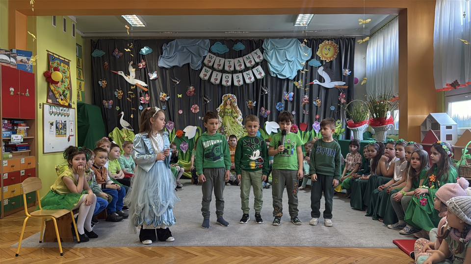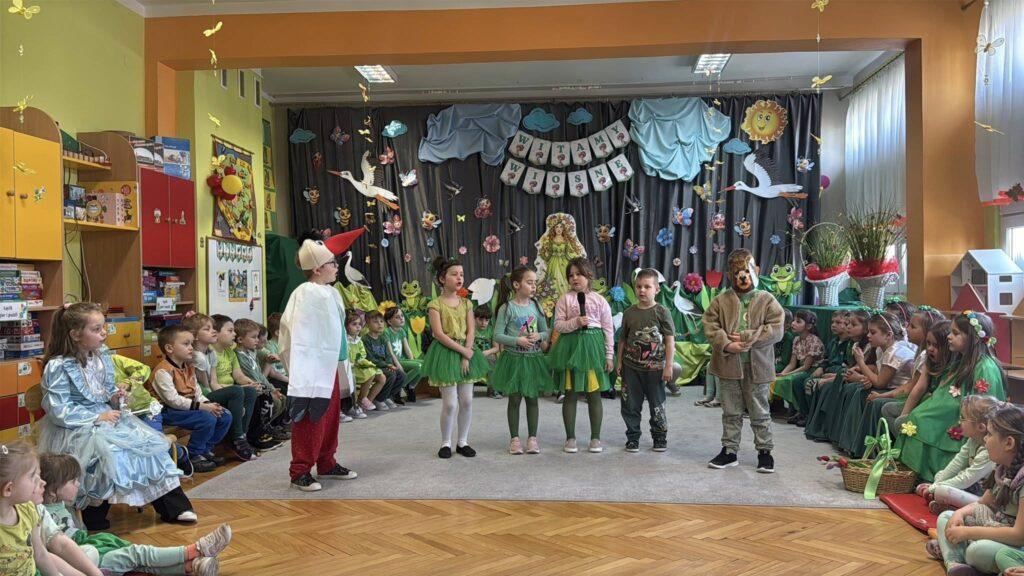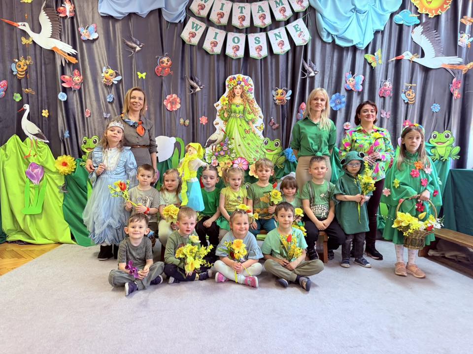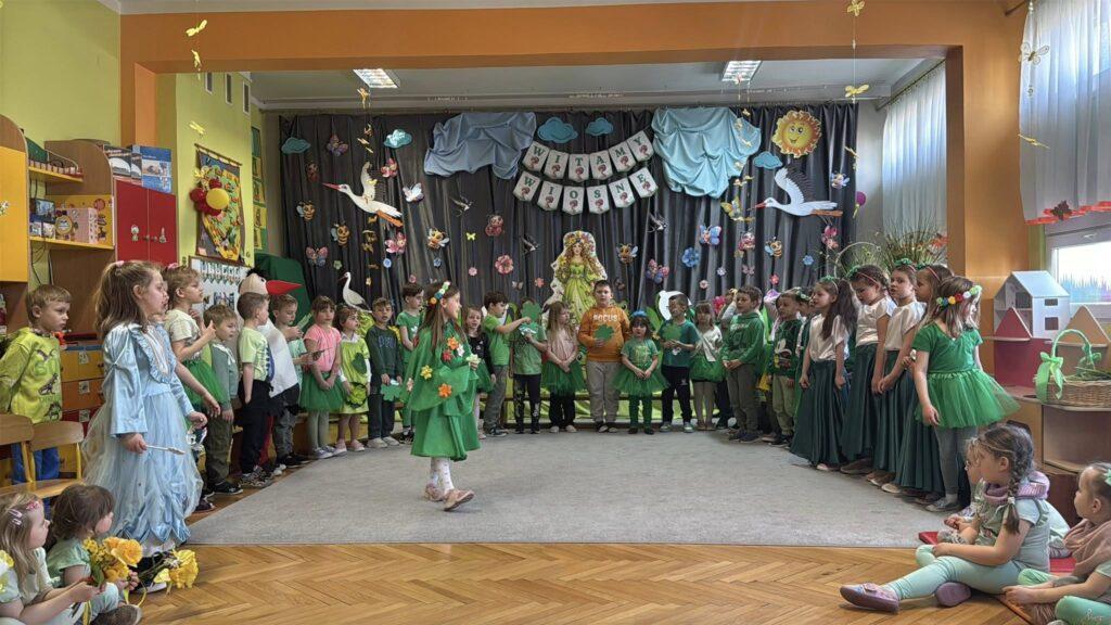 Dzieci zaprezentowały piękną scenkę pt. „Gdzie jesteś, Wiosno?”, w której pożegnaliśmy Panią Zimę i z radością przywitaliśmy nową porę roku. Nie zabrakło wspaniałych występów, piosenek, tańców oraz barwnych postaci – pojawił się bocian, niedźwiadek, a nawet sama Pani Wiosna!